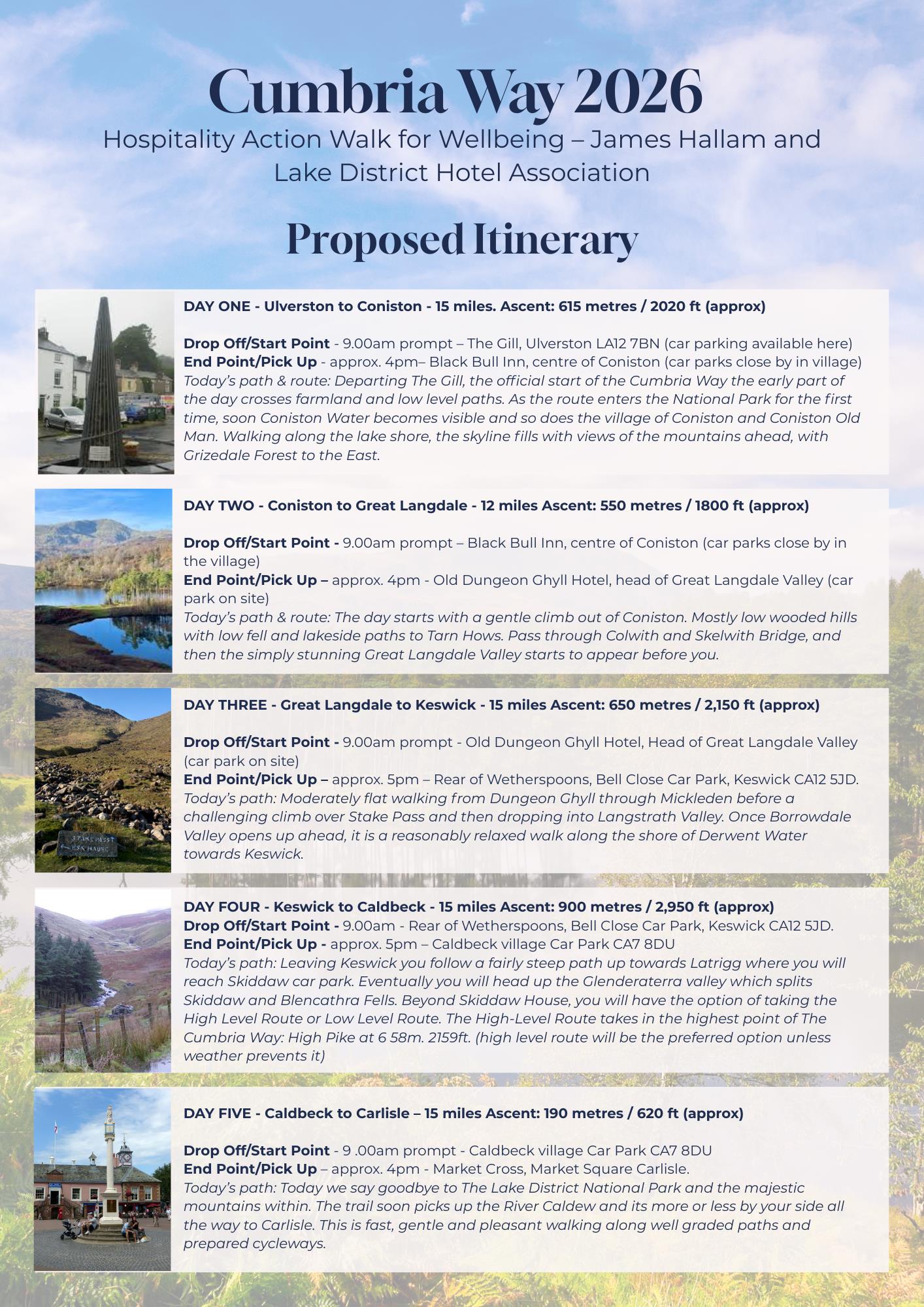 I am leading a joint walk between James Hallam Insurance Ltd's Hospitality Team and Lake District Hotels Association covering the whole length of the Cumbria Way from South to North and will be joined by colleagues from the insurance industry and Lake District hotels.