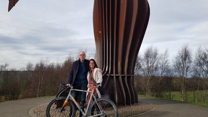 Lindsay and I wanted the colours and images to represent something that meant something to us. The colours reflect the Angel of the North in a certain light and then to black (Lindsay likes a primary colour). The sculpture has a deep meaning to everyone who experiences it and of course to the local community, including Lindsay. It is made of weathered steel, the bike is made of titanium. They are built to last!