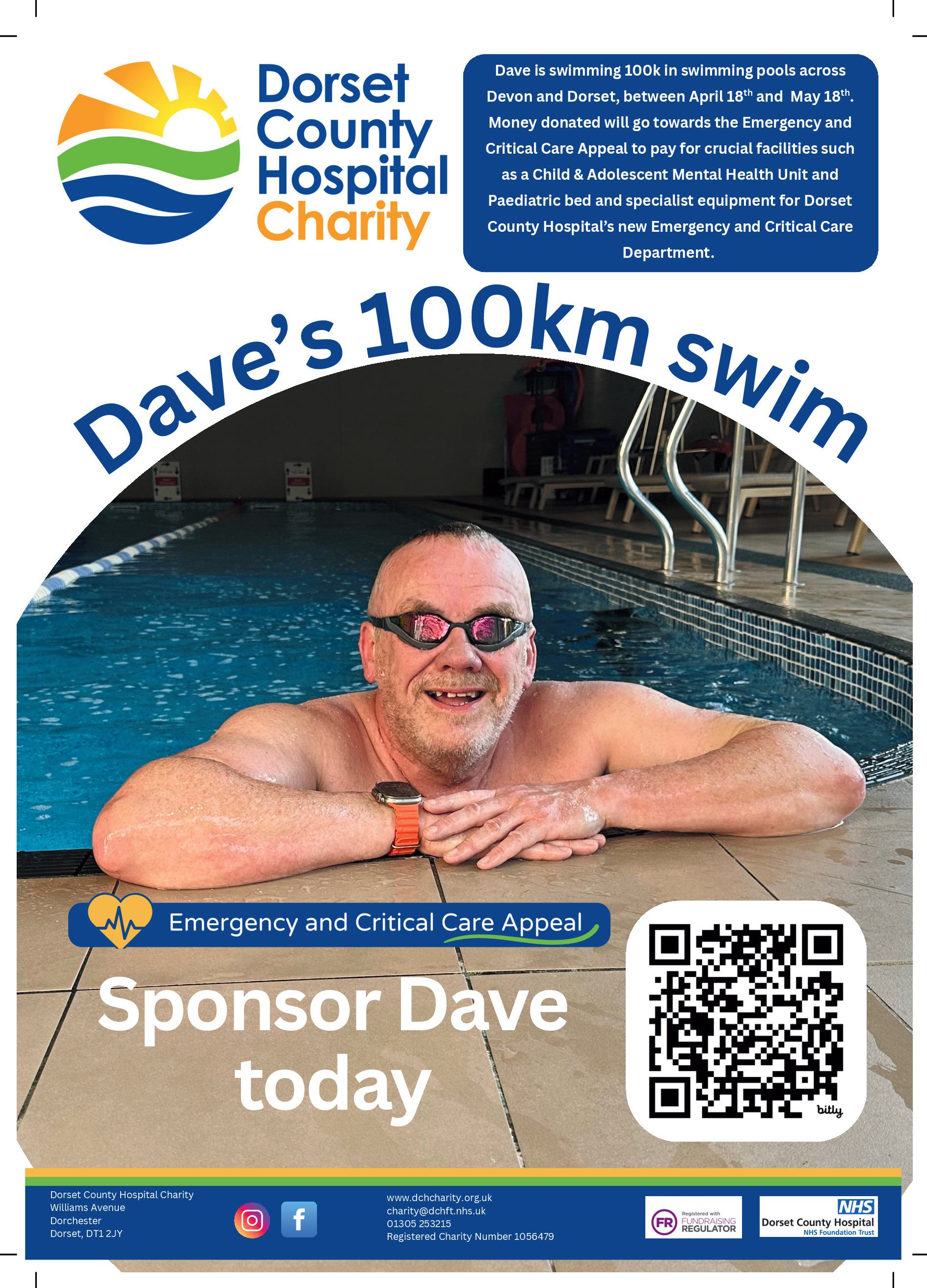 This hugely successful event will be run again over the weekend of 17/18 May this year - and this year I want to play an active part - but not by running or walking - my DCH Challenge will be to swim 100km between 18th April and 18th May - hopefully completing my last swim at a pool in Bridport in time to greet those completing the 2025 walking & running DCH 100 Challenge!