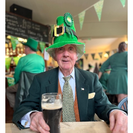 At the pub, with dog treats tucked snug in his coat,