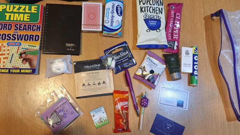 The care packs contain a mix of practical items, distractions and treats with the idea being to bring comfort and kindness to patients facing treatment or surgery for cancer. The packs include items such as herbal teas (for nausea), bed socks, puzzle books, earplugs, notebooks, lip balms, playing cards, mini toiletries for hospital stays, sweets and chocolates, mints, biscuits/flapjacks, pocket tissues etc. Essentially – we aim to spread a ‘touch of sparkle’ to patients and lighten their load at a difficult time.