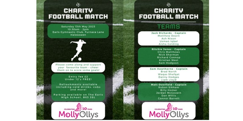 Alongside 3 teams of colleagues from Gallagher in Brierley Hill - Ritchie Jones, Richard Connop, Nick Sharman, Chris Matthews, Russell Jones & Sam Hodgson aka 'FarTooOld FC' will be taking part in a 5 a side football tournament to help raise money for the wonderful Molly Olly’s Wishes charity.