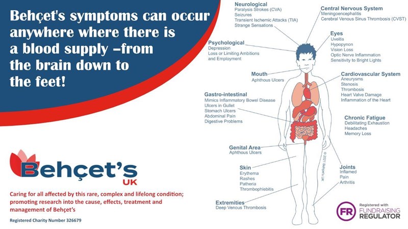 My amazing wife suffers for Behçet’s disease, how she copes is a mystery. It’s a very rare, unheard of disease. Behçet’s UK cares for all those affected by Behçet’s including patients and their carers. We promote research into this rare, complex, and lifelong condition and our ultimate aim is to find a cure but in the meantime, we will strive to obtain the best care for all Behçet’s patients.