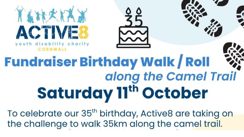 Thank you for visiting our JustGiving page! We will be walking 35km with Active8 (an exciting challenge!), taking part in their "35km Camel Trail Walk, Wheel and Roll" 35th birthday fundraiser on October 11, 2025, to support their amazing work. They are dedicated to making a positive difference to young people's lives, and your support can help them continue their vital mission to empower and motivate young people, aged 14-30 years old, who have a physical disability.