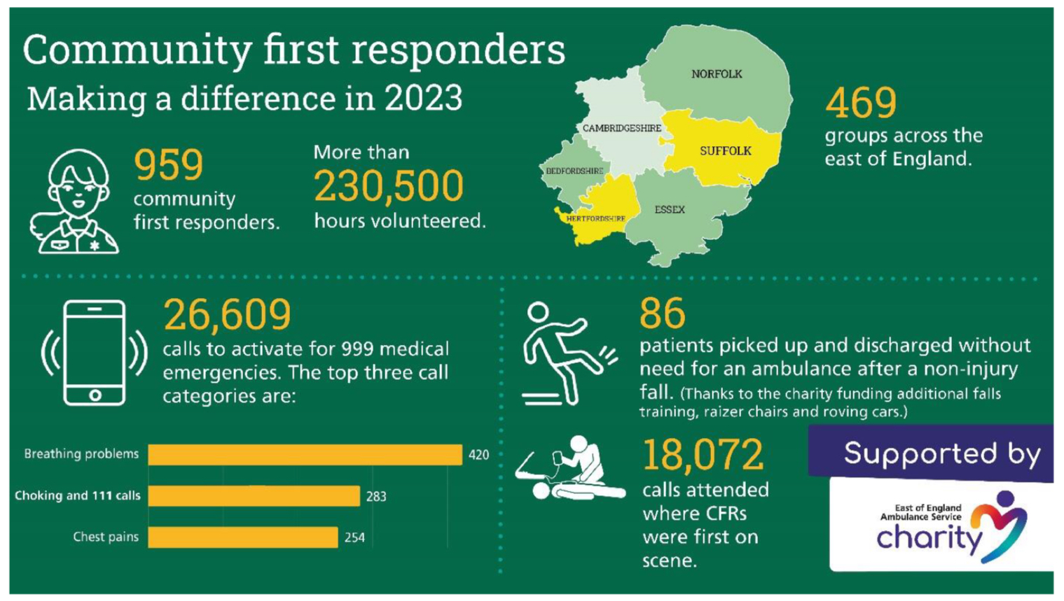 “Community first responders are professional volunteers across the east of England who attend life threatening 999 calls in their local area. They are often first on scene prior to the ambulances arrival and able to provide vital life-saving care until the ambulance crews arrive”.