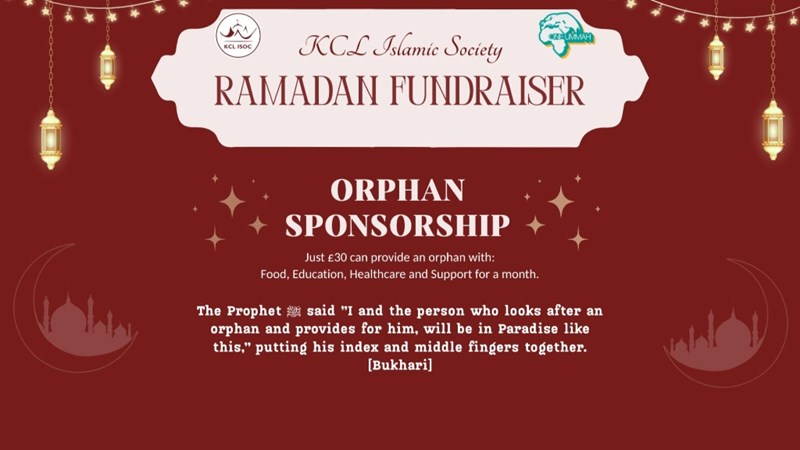 This Ramadan, King’s ISOC is raising £36,000 to sponsor 100 orphans for a full year. Your £30 a month provides food, healthcare, education and essential care. Support an orphan today and earn lasting reward through Sadaqah Jariyah.