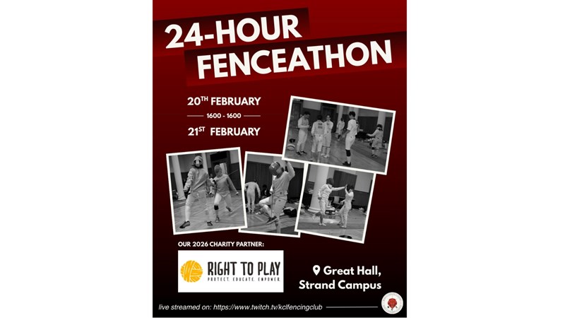 From 📅 20-21 February, we’ll be fencing nonstop for 24 hours to raise money for Right To Play. The event will take place in the 📍Great Hall, Strand Campus, and will be live-streamed on Twitch, so you can support us wherever you are.