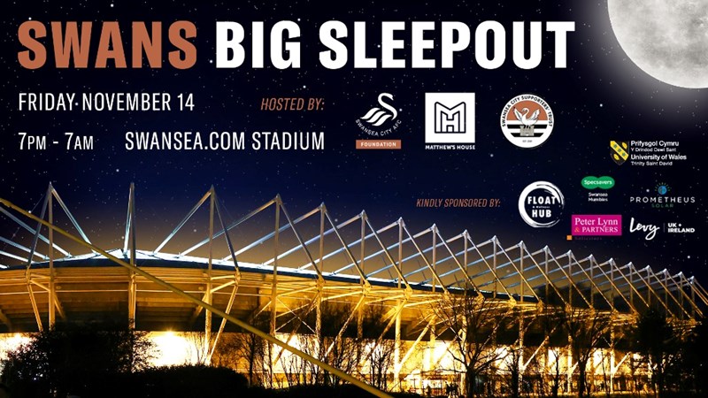 Matthew’s House and Swansea City AFC Foundation are again hosting a Swans Big Sleep Out at the Swansea.com Stadium, to raise awareness of homelessness and some of its causes. Join us on Friday 14th November 2025, or sponsor those who do.