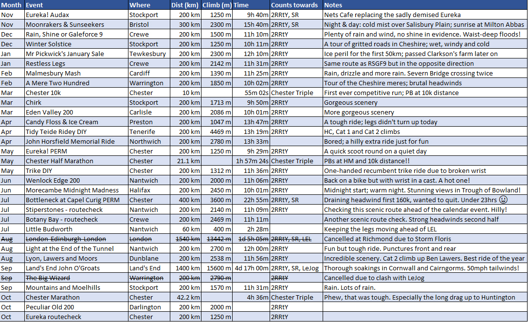 Double Randonneur Round the Year (2RRtY): At least two randonneur (200km+) cycle events per month for an Audax year (Nov-Oct).