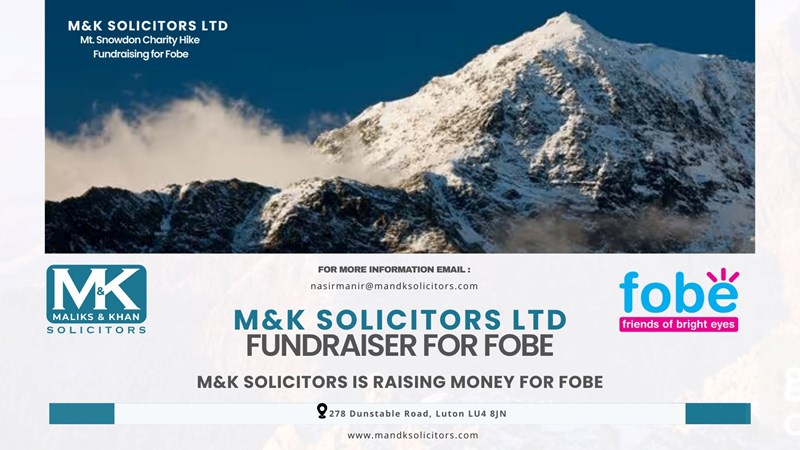 We are excited to announce that the team at M&K Solicitors will be taking on a charity walk up Mount Snowdon, the highest peak in Wales, to raise vital funds for FOBE – Friends of Bright Eyes, a Luton‑based registered charity that provides life‑changing support for children and adults with disabilities.