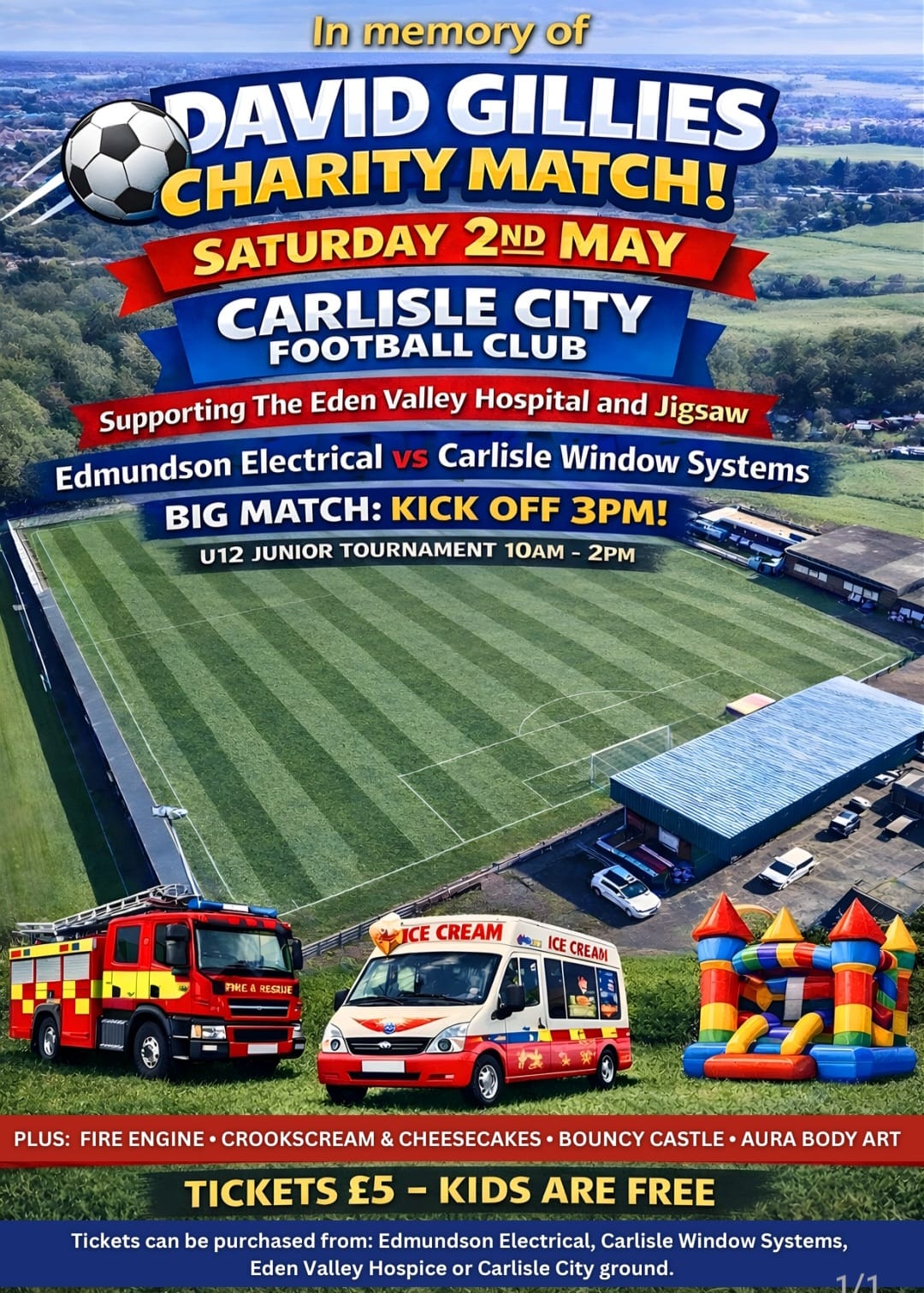 Just to say a massive thank you to the u12s teams taking part, crookscream & cheese cakes, aura face painting, just messin, Carlisle firebrigade,carlisle city fc, the lads from Bob Lancasters electrical, SH electrical, Carlisle window systems,army cadets CRFM and final the boys from Edmundson electrical and the lads from Birmingham.
