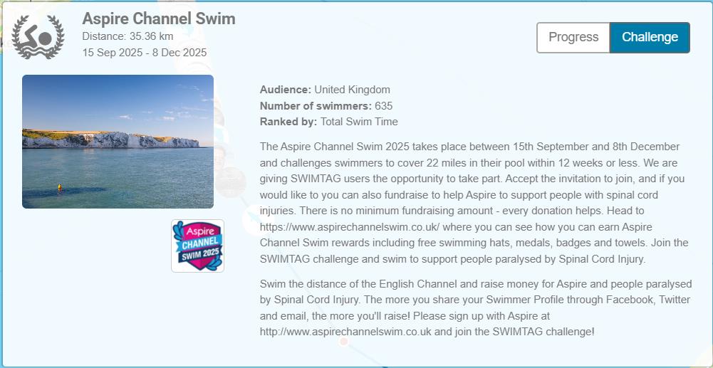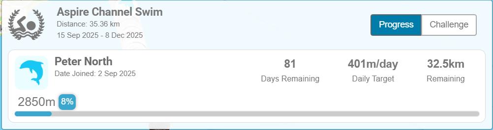Some of you may know that I have recently taken swimming back up and have managed to cover a fair bit of distance so far. As a result I have taken up the Swimtag Aspire Channel Swim Challenge. I will be swimming 35.36km between 15 September and 8 December 2025 (12 weeks) roughly 3km per week. As of 17 September I have made it to 2.85km