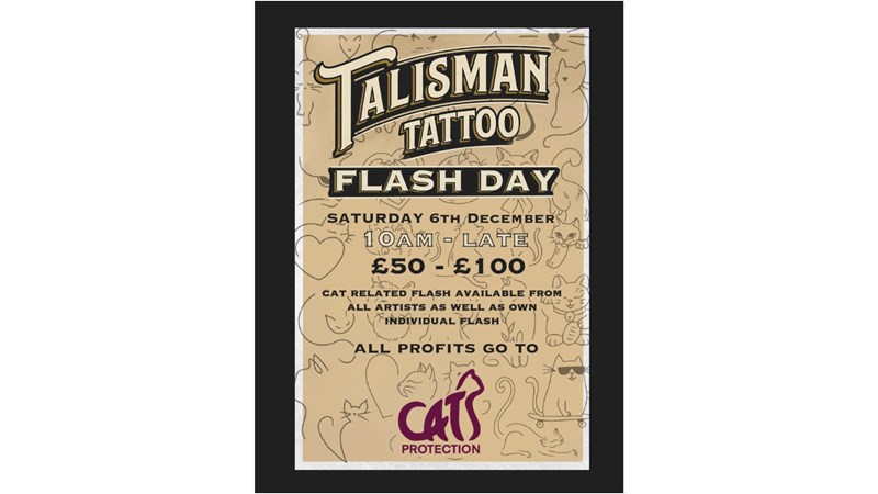 Talisman Tattoo is hosting Tatts4Cats — a one-day flash tattoo takeover to raise funds for Cats Protection Plymouth Branch.
