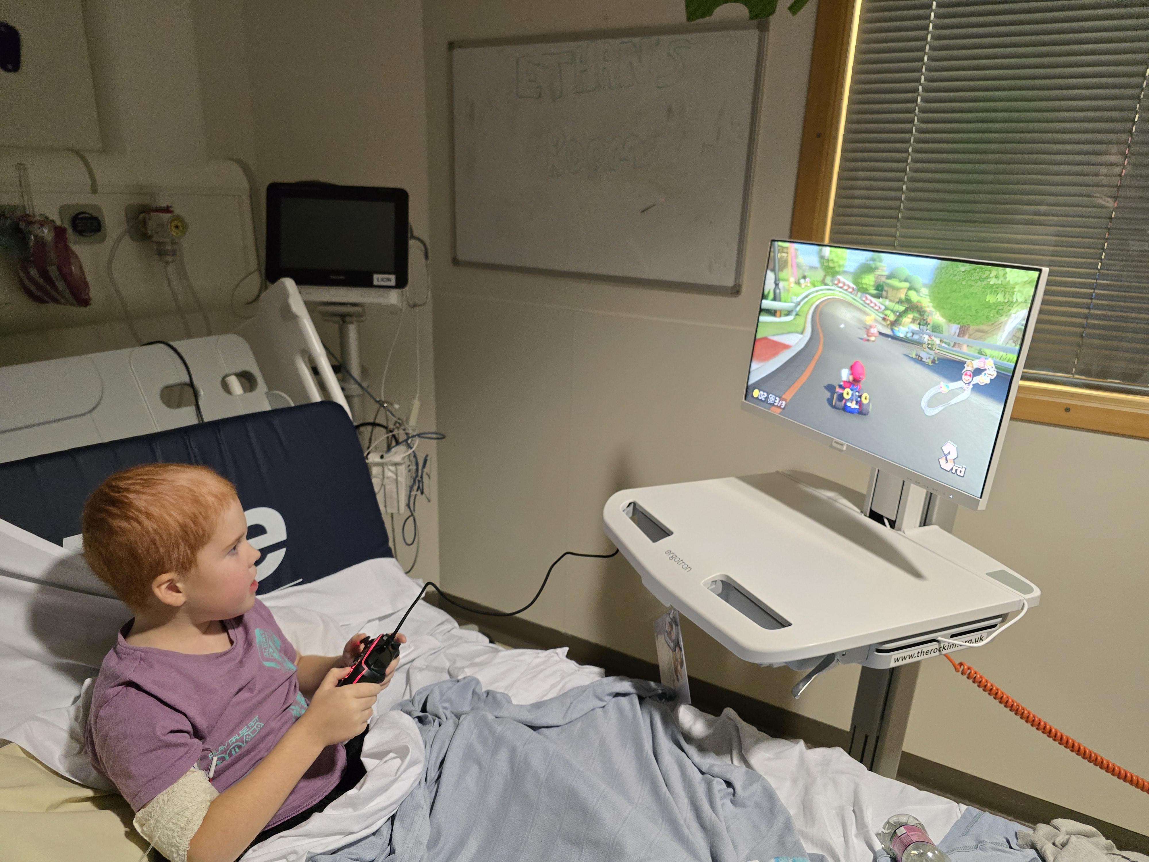 The day they wheeled in a games cart was awesome! This was a cart that had a Switch games console, a large screen, inbuilt games and extra controllers. We had a lot of fun that weekend (as did his siblings when they visited), and it really lifted his spirits. We would love to raise enough money to fund one of these games carts for the Starfish Ward to provide other children with the same distraction and enjoyment Ethan had. DanTDM donated ALOT of these to GOSH and has inspired us to do the same (on a much smaller scale!) for our local hospital. We even met him while we were there, and Ethan beat him at Mario Cart.