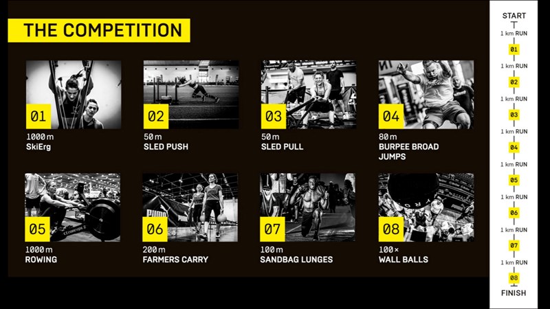 HYROX combines both running and functional workout stations where participants run 1km, followed by 1 functional workout station, repeated 8 times. The stations include: 1000m Ski Erg, 50m 202kg Sled Push, 50m 153kg Sled Pull, 80m Burpee Broad Jumps, 1000m Row, 200m 64kg Farmers Carry, 100m 30kg Sandbag Lunges, 100 x 9kg Wall Balls.