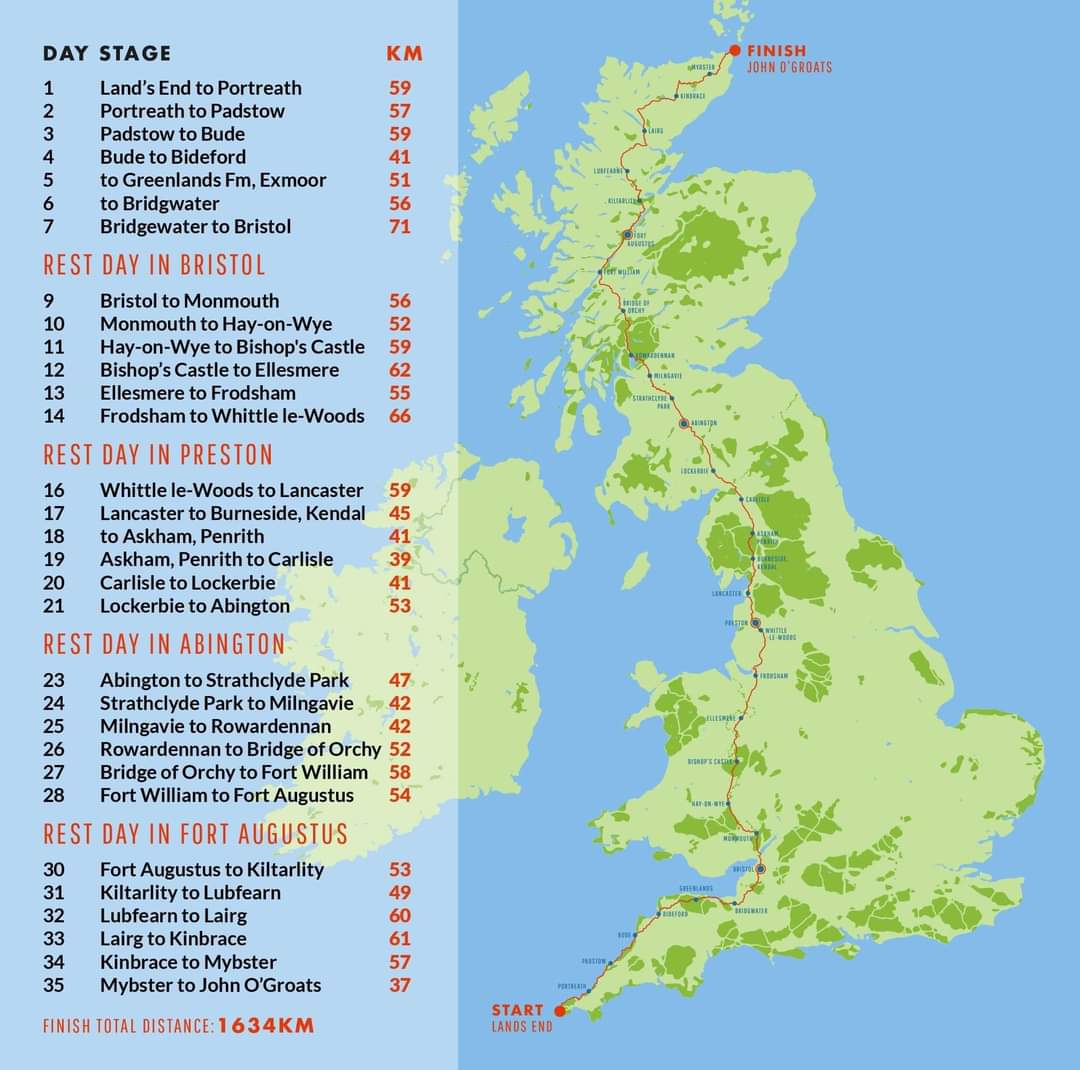 On 31st May 2025, I'll set off from Land's End, and arrive at John O'Groats, 5 weeks later, on 4th July. The plan is to run (and hobble!) over 1000 miles, averaging at about 34 miles every day for 5 weeks, with 4 rest days. If you feel able to donate, even just a small amount, to help me support Sue Ryder Manorlands along the way, that would be amazing! The challenge is self-funded, so every penny raised will go towards the charity.