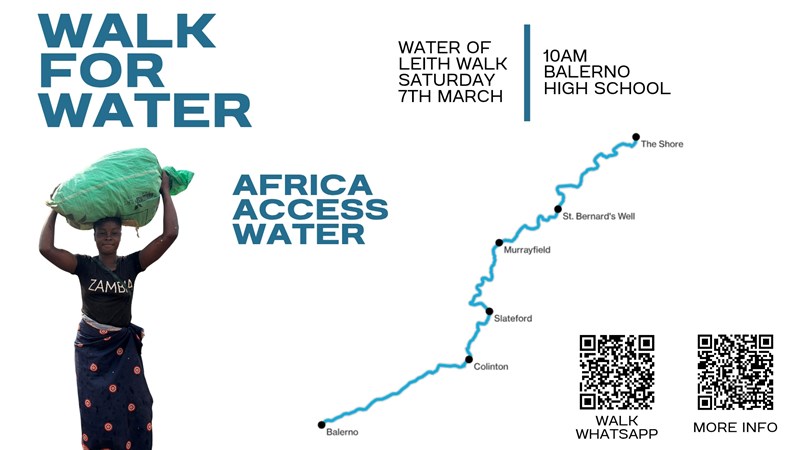 Walk for Water is a community fundraising challenge supporting Africa Access Water (AfAW). Participants will complete the Water of Leith Walk - totalling 20 kilometres - to help fund solar-powered water systems that deliver clean drinking water, support food production, and generate livelihoods.