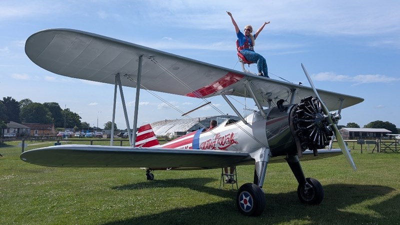 Wendy will be strapped to the wing of a Boeing Stearman biplane, soaring through the air at speeds of up to 135 mph. It’s loud, it’s windy, and it’s very, very high up.