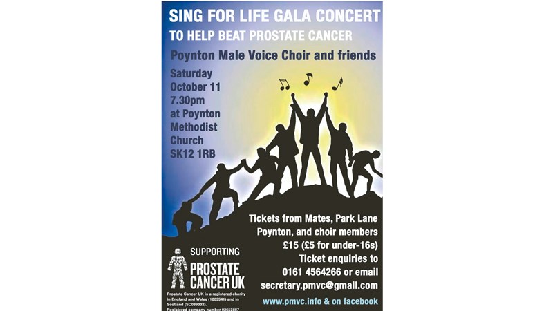Together with the Poynton Male Voice Choir, 40 men from all walks of life have stepped up to "Sing for Life" in support of Prostate Cancer UK. With just 6 weeks to prepare and little prior knowledge of a tenor from a baritone, it's time to step out of their comfort zone for a special gala concert. Singing hits from Les Miserables, Tom Jones, Frank Sinatra and more, we'd love to make this not only a memorable night for those in attendance but also a profitable one for Prostate Cancer UK.