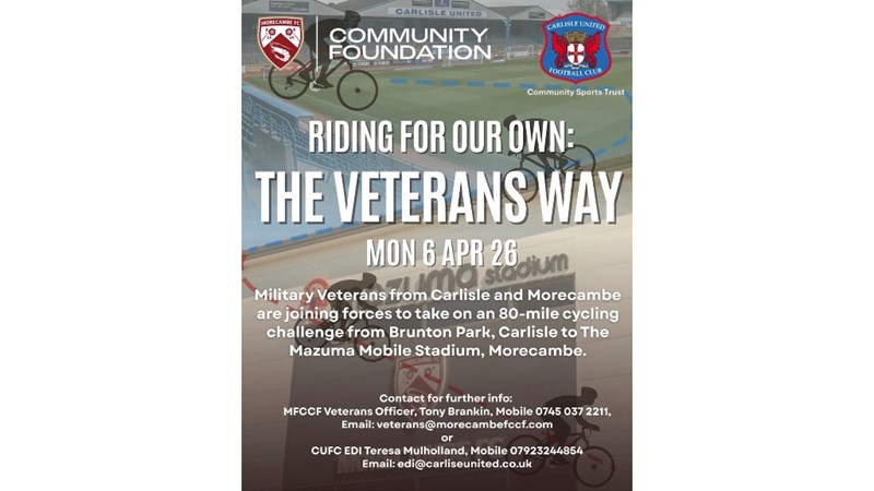 On Monday 6th April 2026, Armed Forces Veterans from Morecambe will join forces with Armed Forces Veterans from Carlisle to complete an 80-mile cycle ride from Brunton Park (Carlisle United FC) to the Mazuma Stadium (Morecambe FC).